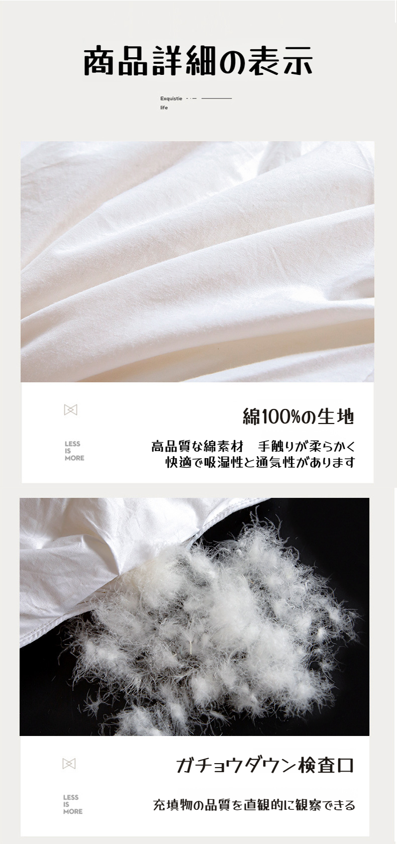 高品質羽毛素材を使用した布団のクローズアップ